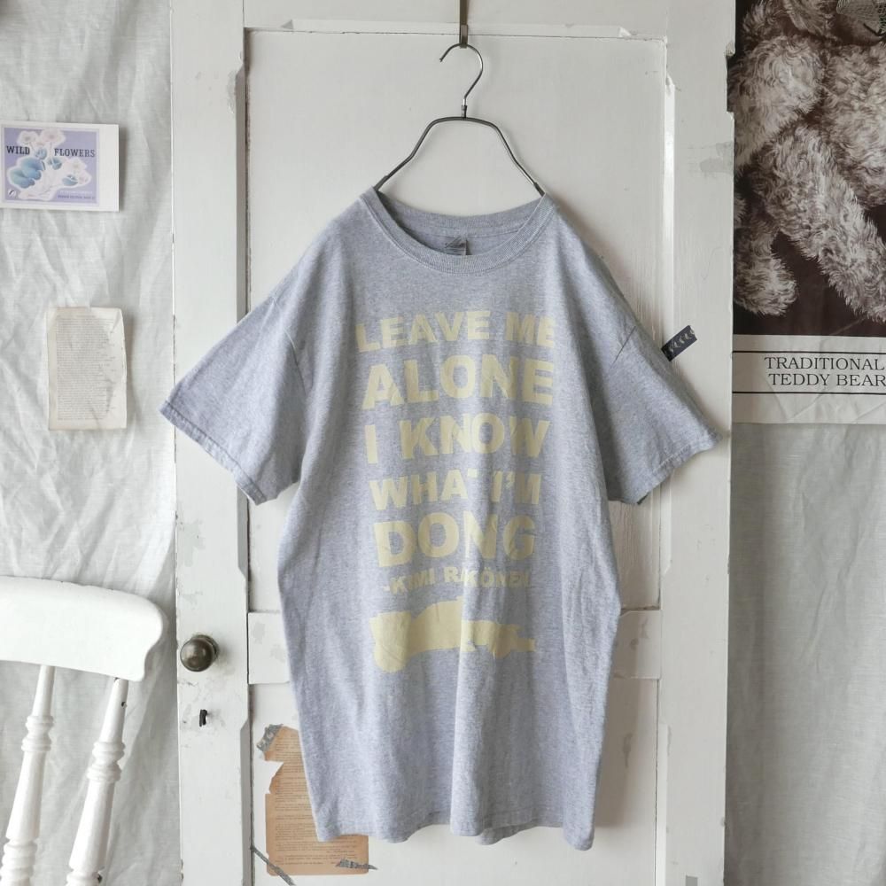 ライトグレーの薄手GILDANボディに淡いクリームイエローのロゴ。 LEAVE ME ALONE I KNOW WHAT I'M DOING -Kimi Raikkonen