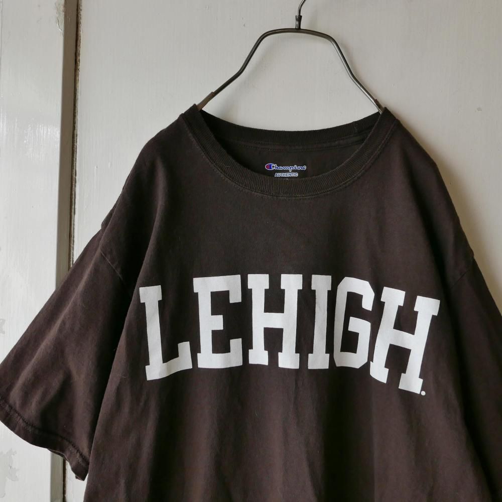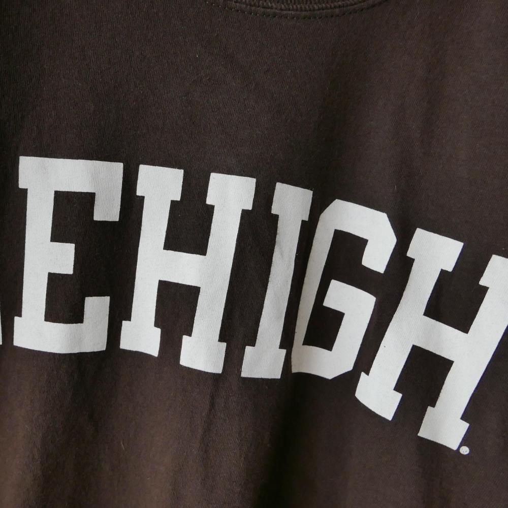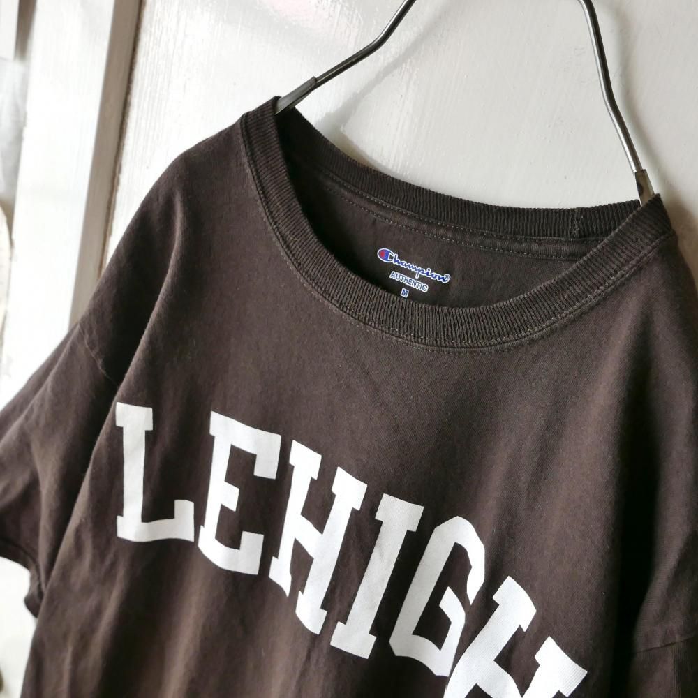 Champion Tシャツ。ダークブラウンのボディにホワイトのLEHIGHロゴ。左袖先にはChampionロゴ刺繍ワンポイント。