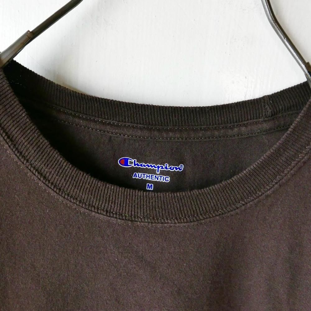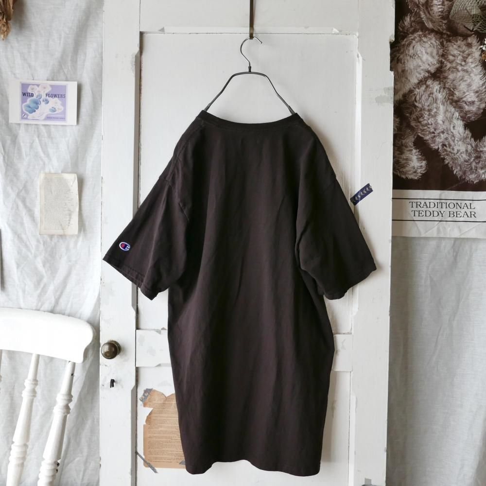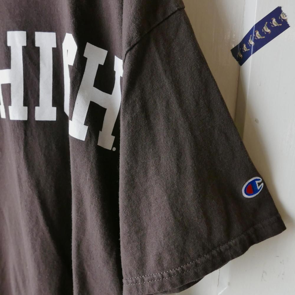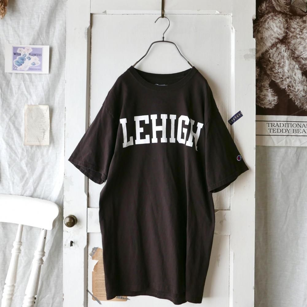 Champion Tシャツ。ダークブラウンのボディにホワイトのLEHIGHロゴ。左袖先にはChampionロゴ刺繍ワンポイント。