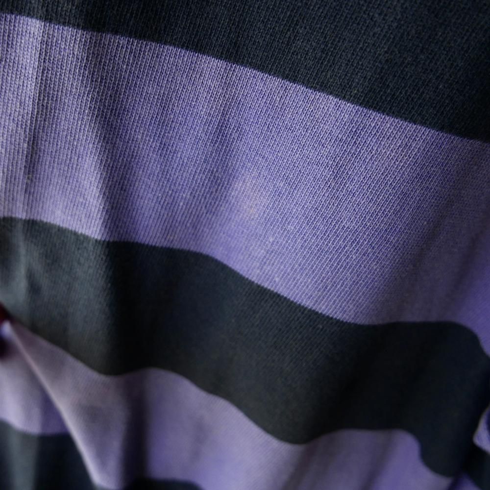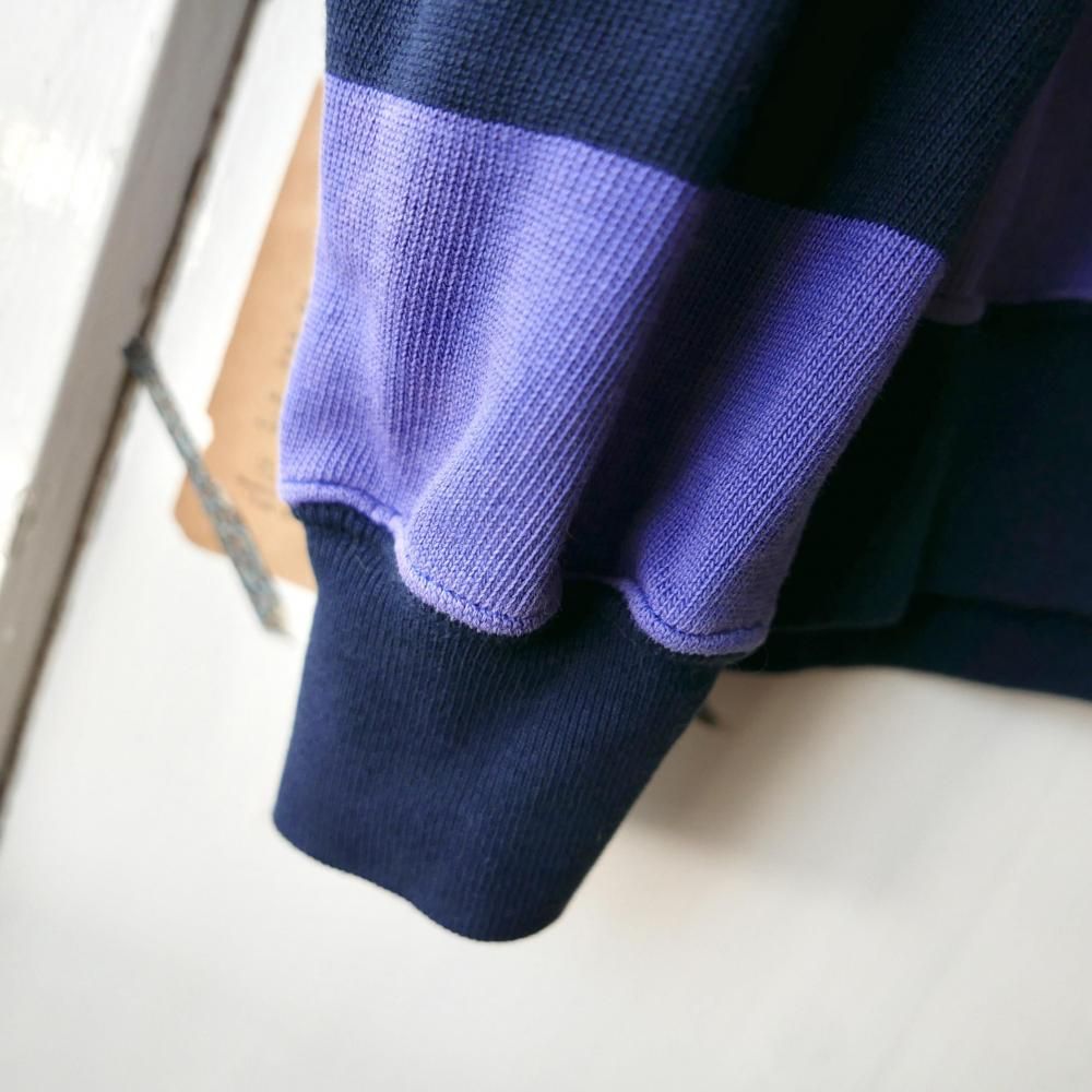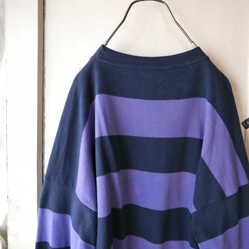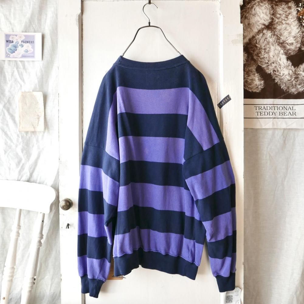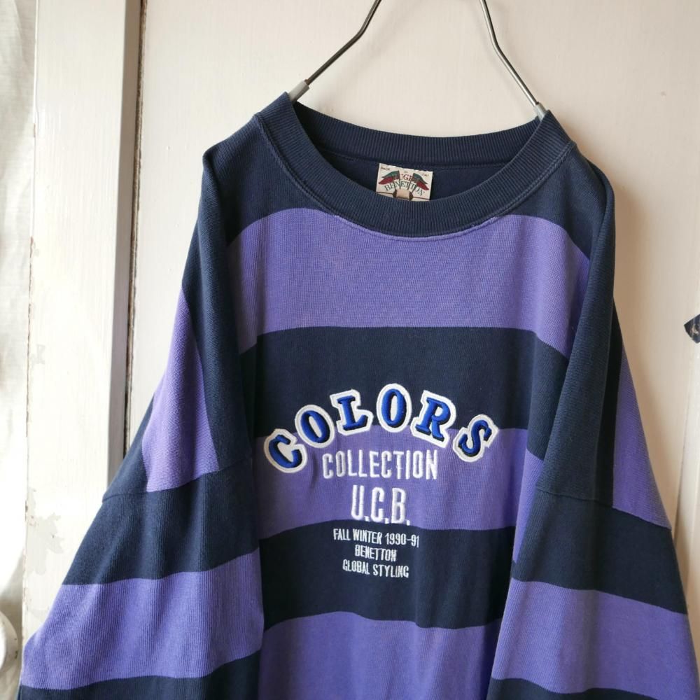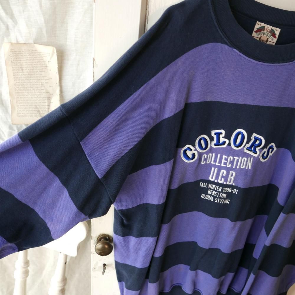 BENETTON/ベネトン ヴィンテージスウェット。パープル×ネイビーのボーダーにフロントのロゴは刺繍と刺繍アップリケ。身幅広め 且つドルマン寄りの太袖のレトロなシルエット。ダボっとメンズサイズで。