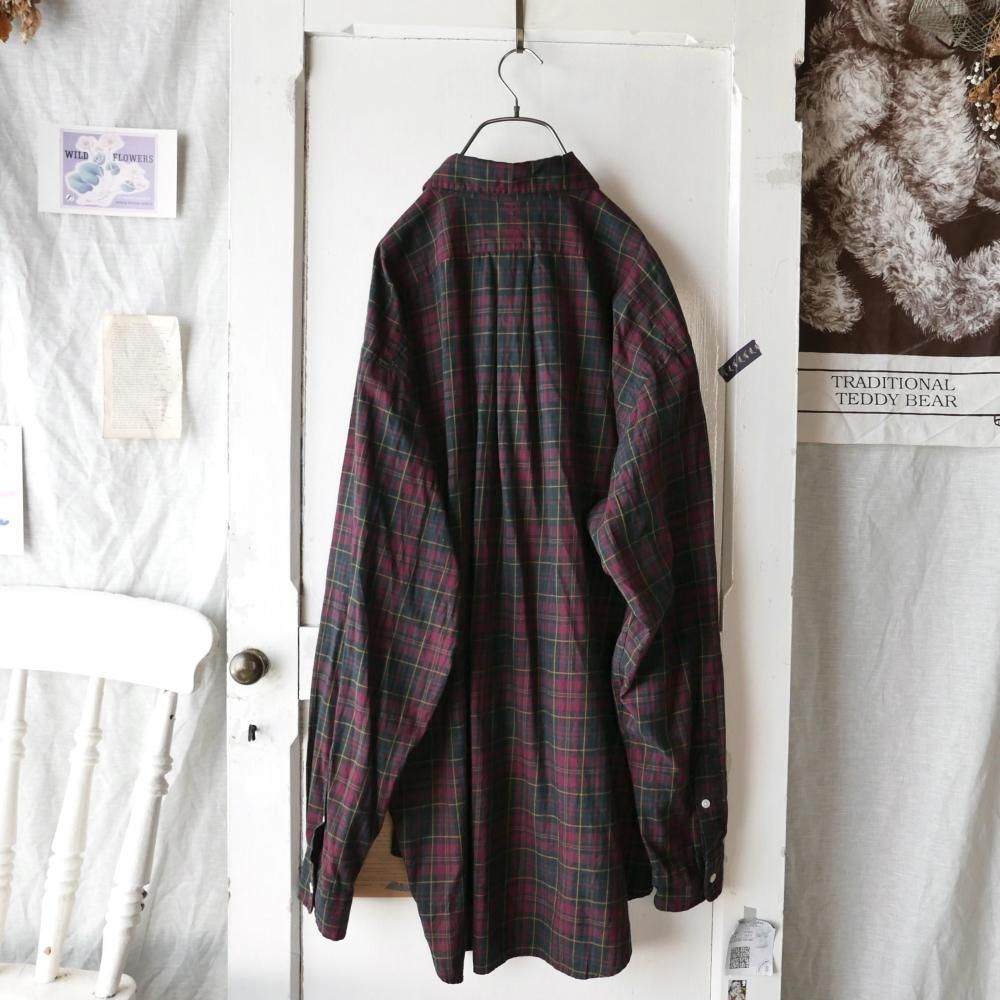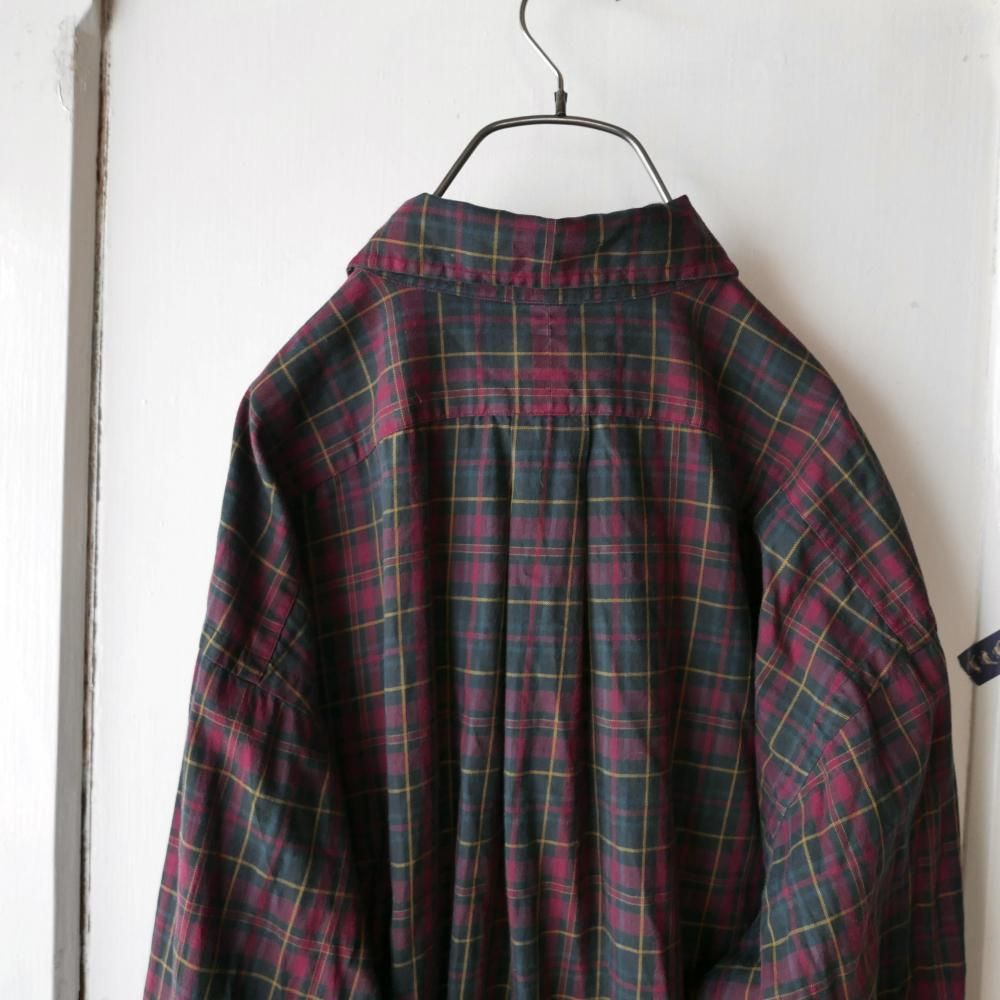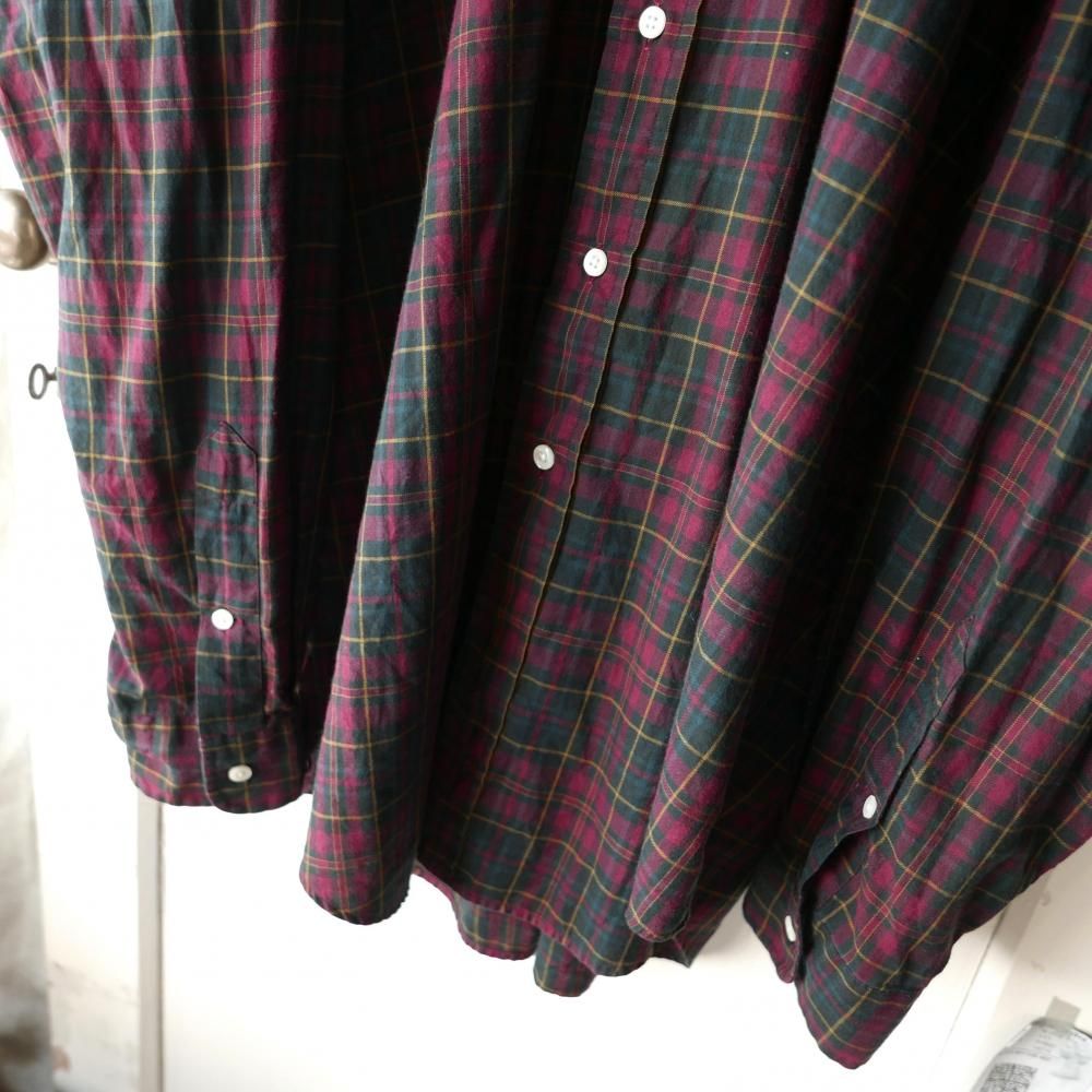 ダークレッドをベースにしたベーシックなタータンチェックパターン。胸にはダークグリーンのポロ刺繍ワンポイント。サラリとしたコットン生地。メンズサイズ。